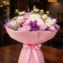 Кустовые розы, хризантема, гипсофила, эустома (лизиантус), лимониум, зелень.