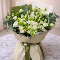 Кустовые розы, эустома (лизиантус), хризантема, эвкалипт.