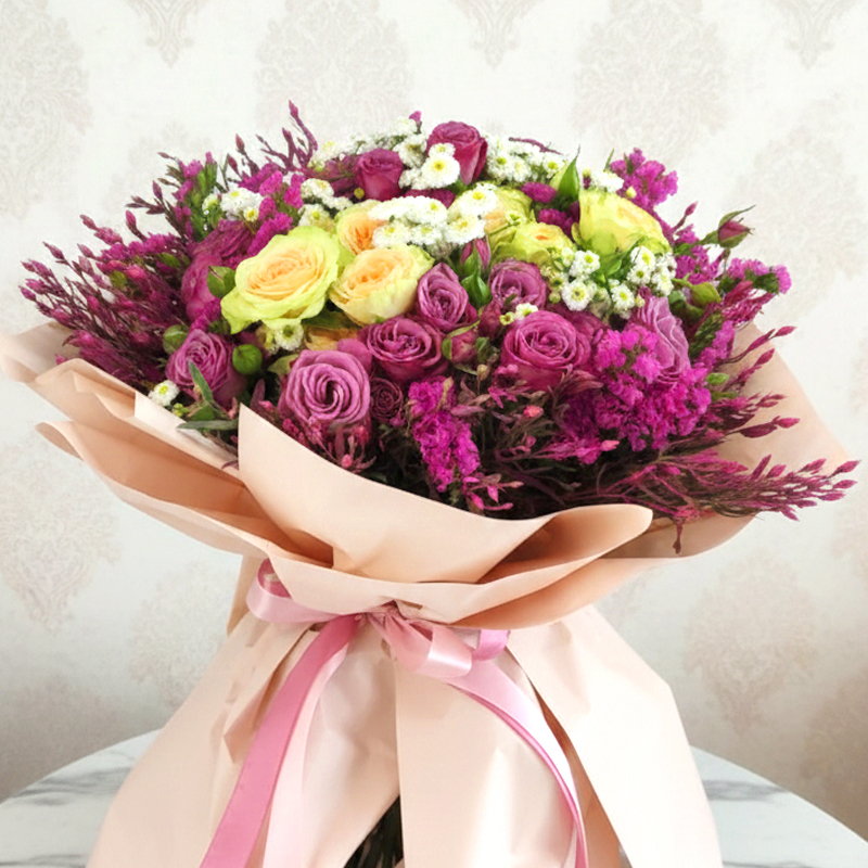Кустовые розы, хризантема, лимониум, зелень.