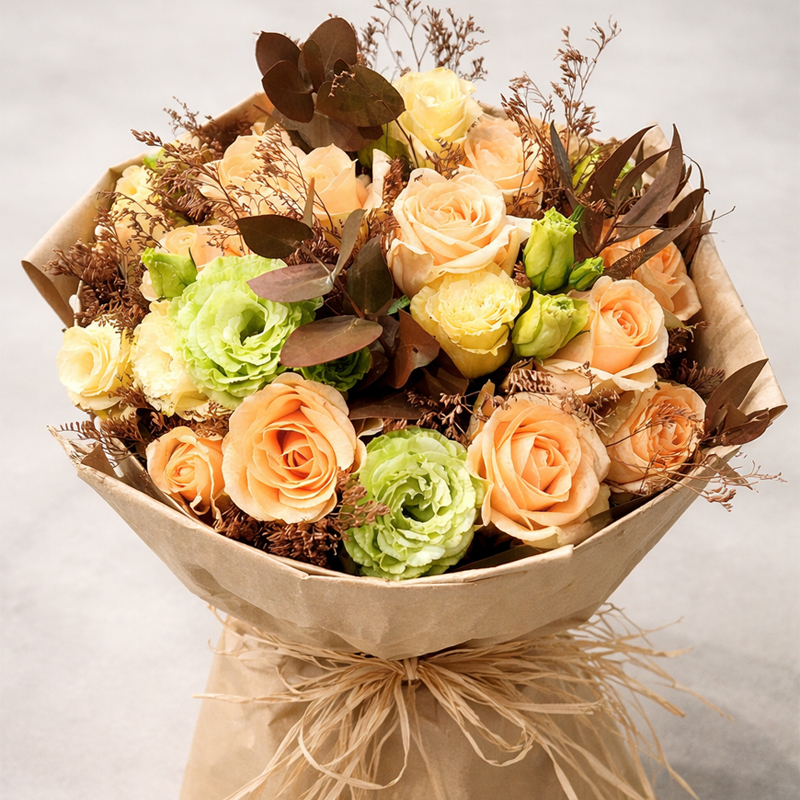 Розы, эустома (лизиантус), эвкалипт, сухоцветы.