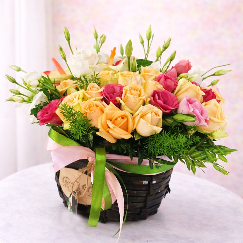 Розы, антуриум, эустома (лизиантус), зелень.